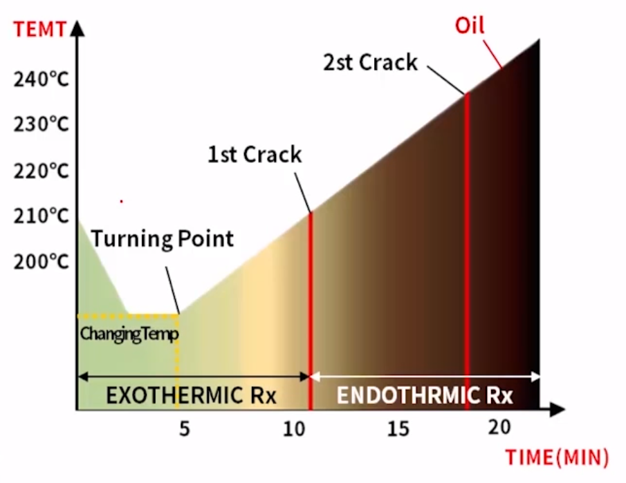 E1차 크랙 이후 발열반응 구간에서는 댐퍼를 열어주어 공기를 주입시켜서 원두의 맛을 끌어올린다. Oil이 생성되게 해서 Full Body로 만든다