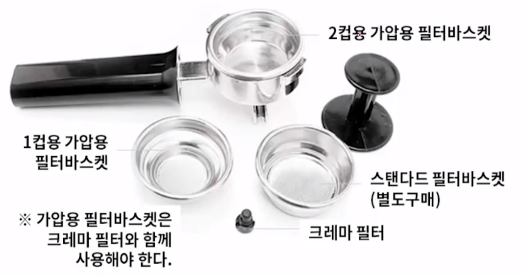 포터필터, 샤워헤드, 저원버튼, 온도조절기, 스팀수...