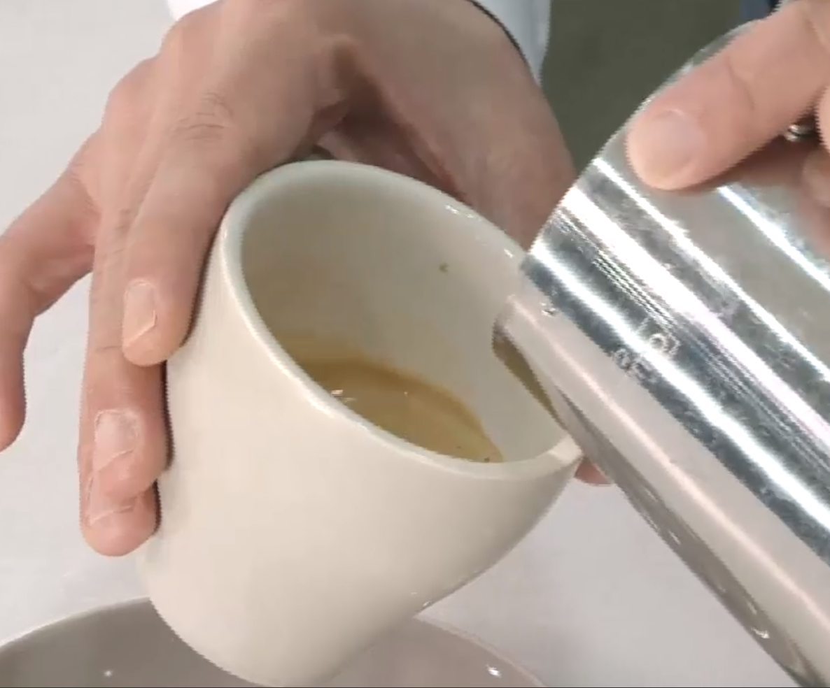에스프레소 잔을 몸쪽으로 15~20도 정도 기울인 상태에서 가장자리부터 천천히 우유를 부어줌