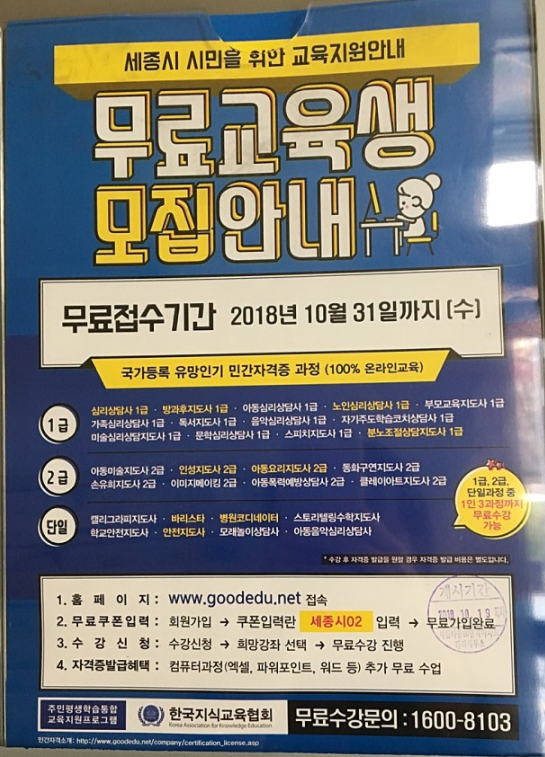 결국 "한국지식교육협회"라는 이름을 가지고 있는 이 "업체"는 무료강좌를 올려놓고 자격증 발급비용 8만원씩을 받는 업체였던 것입니다. 게다가 살짝 더 기분이 나빴던 것은 이 업체.. 아니 협회가 지자체랑 같이 움직인다는 것인데요. 세종시의 예처럼 신청할때 자치구를 넣는 것이 마치 "쿠폰"처럼 인식이 되어서 무료라는 느낌을 주게 되어 있었습니다. 지금의 코로나19 같은 시대에 지자체가 나서서 도와주는 것으로 생각했던 저도 아둔했지만... 많이 서운했습니다. 지자체가 자격증 발급비용을 내주면 모양새가 더 좋지 않았을까요?