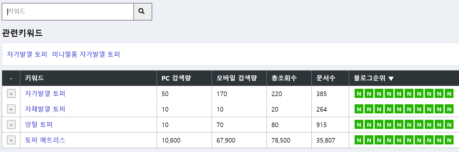 '자가발열 토퍼', '자체발열 토퍼', '양털 토퍼'의 경우는 총조회수에 비해서 문서수가 훨씬 많은 것을 알 수 있는데요. 이러한 문서들은 '토퍼 매트리스'를 키워드로 문서를 작성하면서 서브 키워드를 공략하였기에 생긴 문서들일 가능성이 크지만, 이러한 키워드 하나도 놓치지 않으려는 열성적인 블로거들이 있다는 사실을 보여주는 것이라고 하겠습니다.