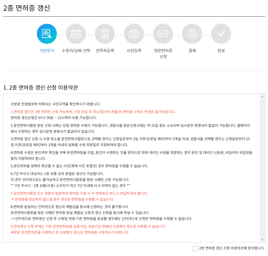 본인인증을 거치고 약관동의를 하고 가지고 있는지, 분실하였는지, 어떤 방식으로 수령할 것인지 등을 결정해서 갱신 신청을 하면 되는데요. 여기서 주의할 점은 홈페이지의 운영시간이 7시30분부터 22시까지니까 이 시간을 꼭 지키셔서 신청하시기 바랍니다.
