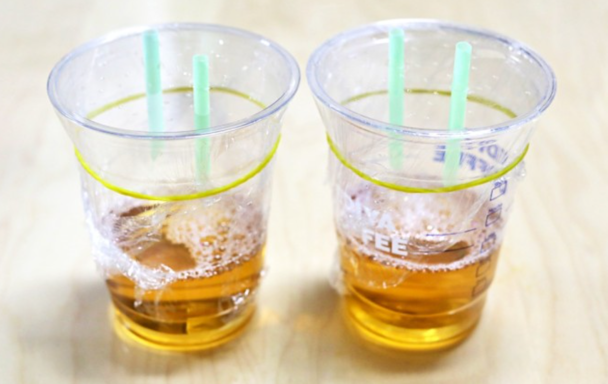 이걸 응용해서 만들면 되는데요. 페트병을 자르거나 일회용 플라스틱 컵의 안쪽에 사과 같은 과일이나 과일 쥬스 등을 넣고 랩으로 덮은 후에 빨대를 여러개 꽂아줍니다. 이러면 초파리가 빨대를 통해서 들어왔다가 빠져나가지 못해서 잡게 되는데요. 간단하게 만들 수 있으니 집에서도 해보시기 바랍니다.