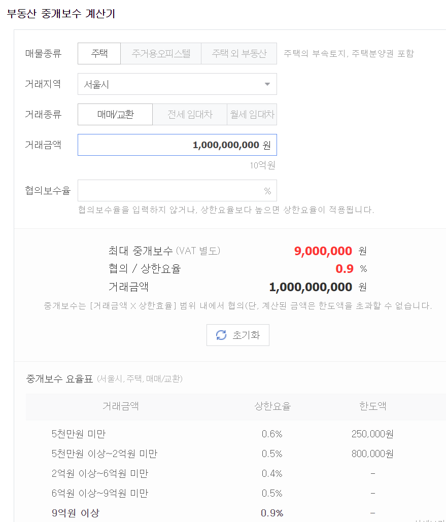 그럼 이번에는 서울의 10억원짜리 주택을 매매하는 경우를 부동산 중개수수료 자동 계산기에 입력해 보도록 하겠습니다. 상한요율이 0.9%가 적용이 되어서 9백만원(VAT별도)까지 지불을 해야 되네요. 10억원 짜리 건물을 매매하는 경우에 거의 천만원(9백9십만원)이 부동산 중개수수료로 지불되어야 한다는 것인데요. 10억원 짜리 건물을 팔고 10억원 짜리 건물로 이사를 간다면, 그냥 온전히 2천만원 가량의 중개수수료를 날리게(?) 되는 것입니다.
