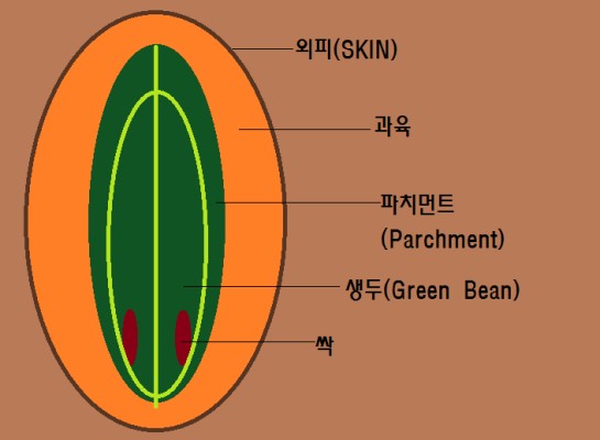 외피, 과육, 파치먼트, 생두, 싹으로 구성